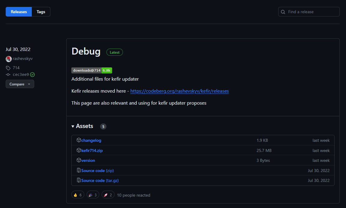 Для того, чтобы скачать прошивку, необходимо перейти в [репозиторий разработчиков](https://github.com/rashevskyv/kefir/releases) и скачать последний релиз. Файл **kefir\*\*\*.zip.**